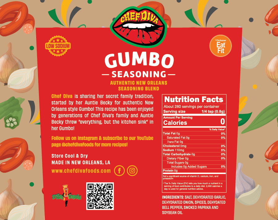 Chef Diva is sharing her secret family tradition, started by her Auntie Becky for authentic New Orleans style Gumbo! This recipe has been enjoyed by generations of Chef Diva’s family and Auntie Becky threw “everything, but the kitchen sink” in her Gumbo! Enjoy this amazing Gumbo flavor in your own homemade Gumbo to make a Seafood Gumbo, Chicken & Sausage Gumbo, Okra Gumbo or a Plant-Based Gumbo. The flavor can also be enjoyed across loads of other dishes as well. Cook like Chef Diva and try this blend as a “Gumbo twist” to hearty soups, French fries, dirty rice and even morning omelets. This authentic flavor is sure to bring New Orleans, to your mouth!