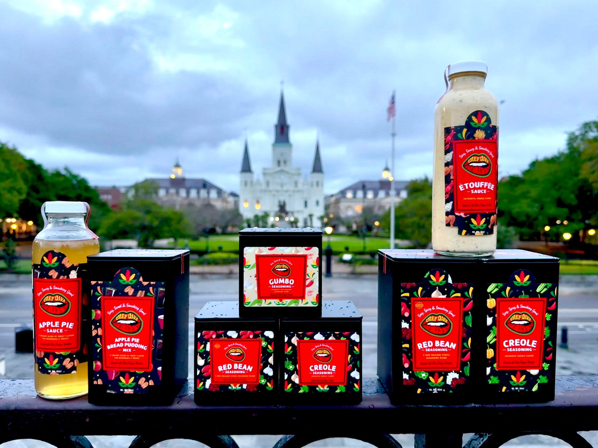 16oz Apple Pie Sauce, 16oz Apple Pie Mix, 8oz Creole, 8oz Gumbo, 8oz Red Bean, 16oz Creole, 16oz Red Bean & 16oz Etouffee Sauce